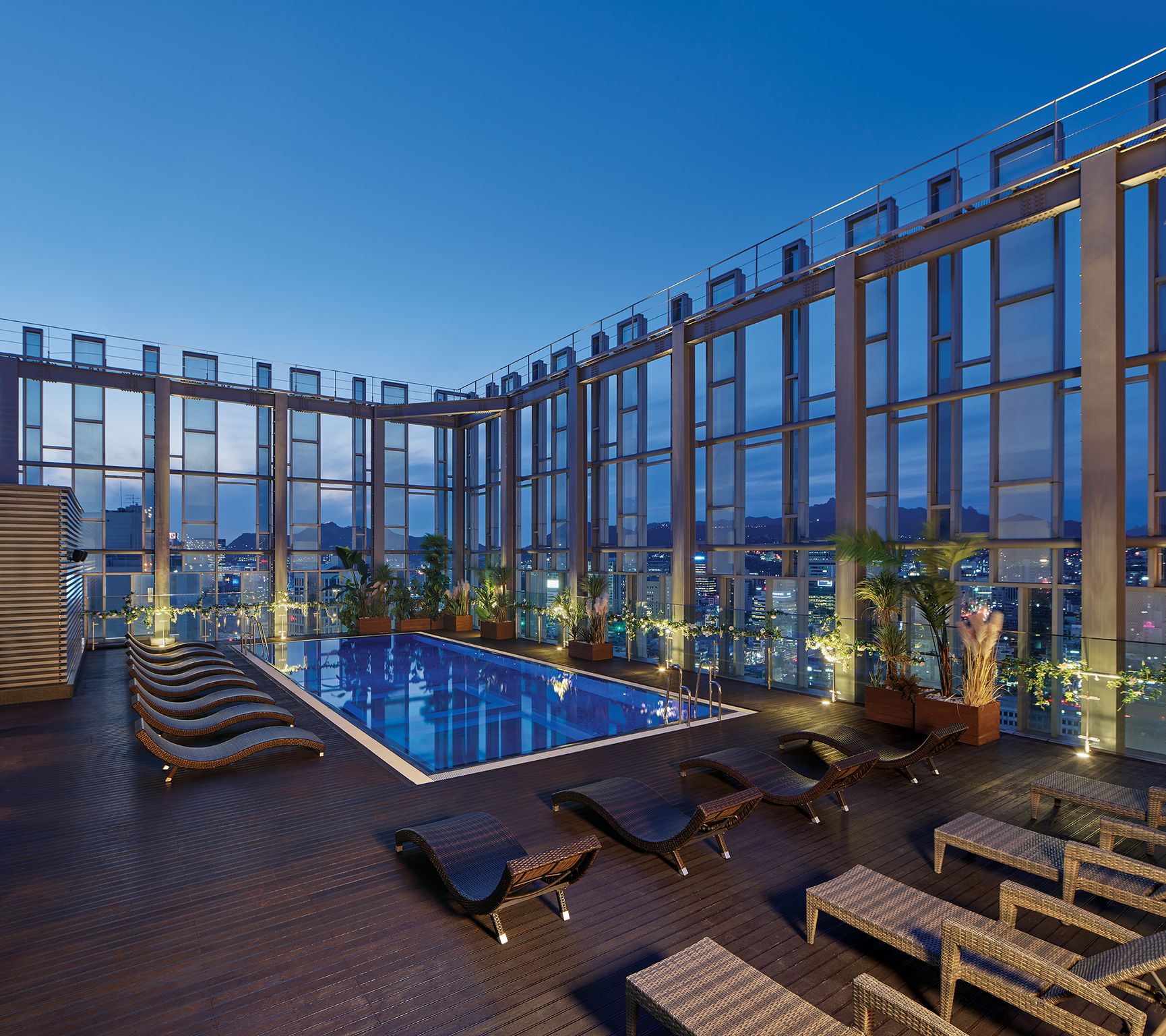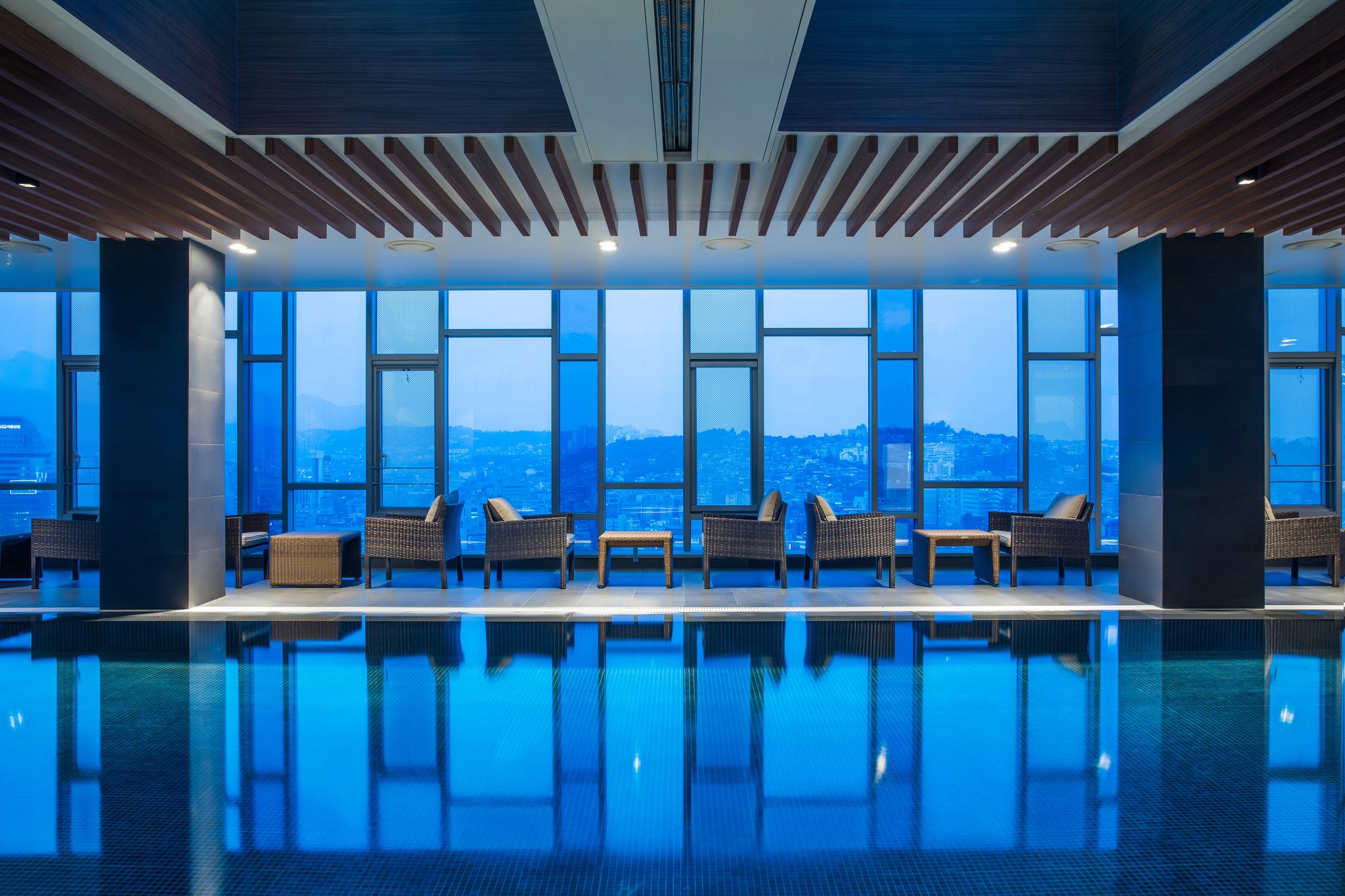 노보텔 앰배서더 동대문의 20층 실내 수영장에는 유리 천장을 통해 자연 채광이 들어옵니다. 21층의 루프탑 야외 수영장으로 올라오면 펼쳐진 서울의 파노라마. 드넓은 하늘 아래 펼쳐지는 도시의 풍경과 일몰 광경은 아주 값진 추억이 될 거예요. 도시의 전망을 배경 삼아 인생 사진을 남기기에도 제격입니다. 해가 지면 도심의 불빛이 수놓은 야경 또한 빼놓을 수 없죠. 자동 수온 조절 및 정수 시스템을 운영하니 쾌적합니다.